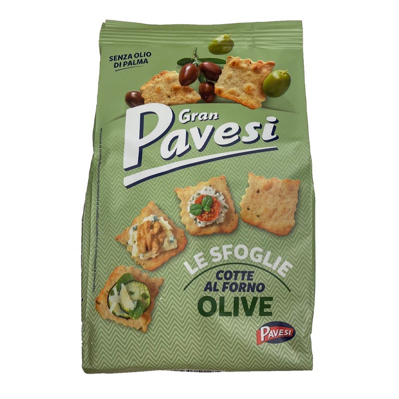 在烤箱中烤製的薄脆餅皮,富含綠色和黑色橄欖的風味,Gran Pavesi的義大利脆餅可隨時享用。