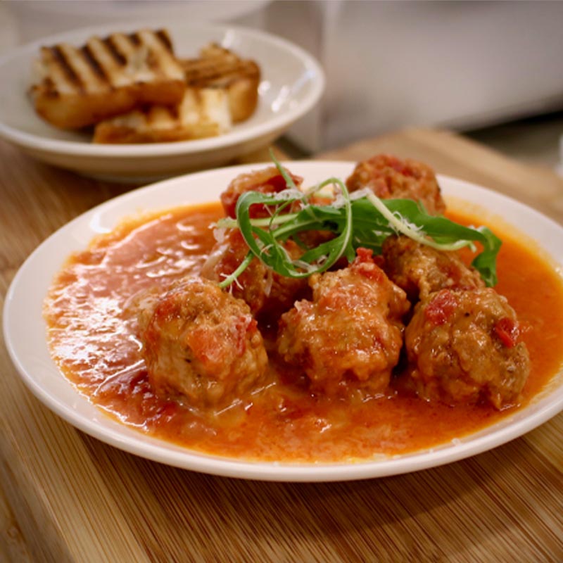 Handmade Italian meatballs with tomato sauce, Spanish smoked paprika, italian mortadella and prosciutto, smoked provola and Gran Moravia parmesan cheese, side with focaccia bread. Kids favorite!