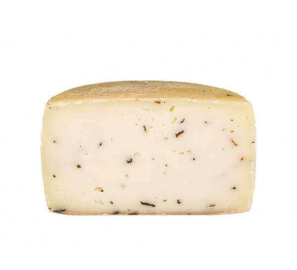 A small truckle of pure sheep’s milk studded with truffles throughout. The thin natural rind encases the cheese which is crumbly but with a smooth mellow taste. The first impact is the sweetness of the milk with the follow-on flavour of the truffles giving an earthy & aromatic taste. They become richer & tastier as they ripen. Pairs well with boar cold colds and a good red wine.