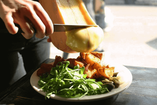 A semi-hard cheese which is thickly sliced and used for melting and grilling. Served with boiled or steamed potatoes and some pickled items, like gherkins, olives, and pickled onions. Cured meats like ham, salami, or prosciutto are also usual accompaniments.